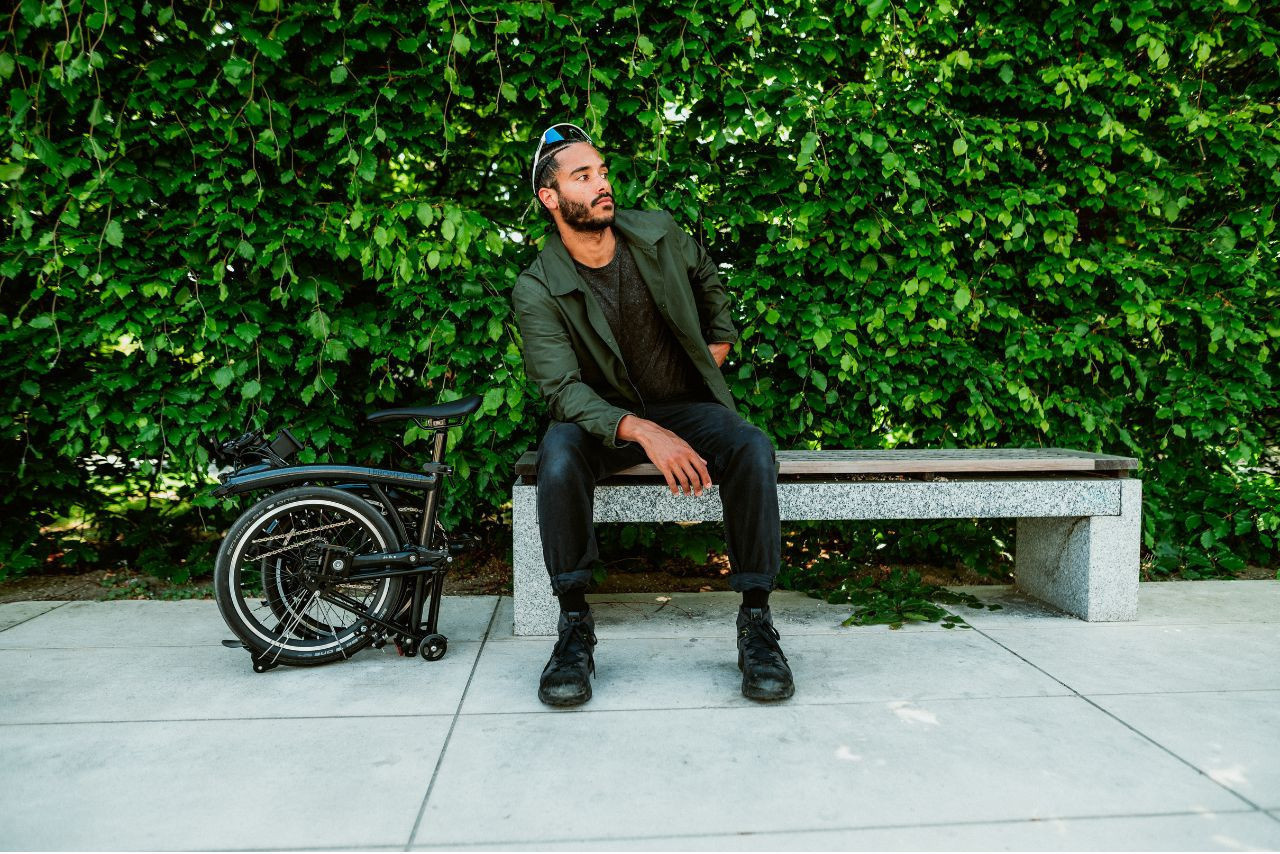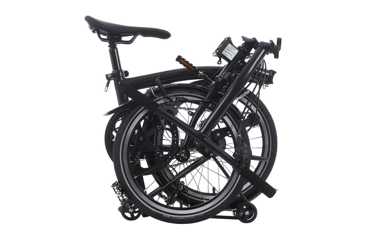 Fold halfway. Steer with the saddle or tow with your handlebar. P Line stays locked together and glides like a wheelie suitcase. Breeze through train stations, along plazas and into buildings. Nothing folds like a Brompton folds.
