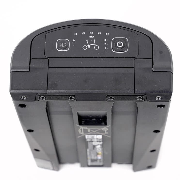 - Top-mounted control button cycles through three power assist levels (1–3) or Off, and adjusts lighting between On, Off, and Auto sensor mode — no phone required.