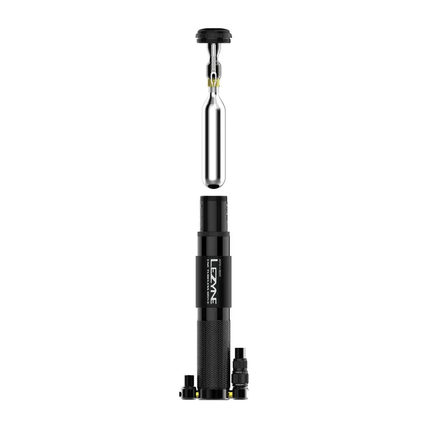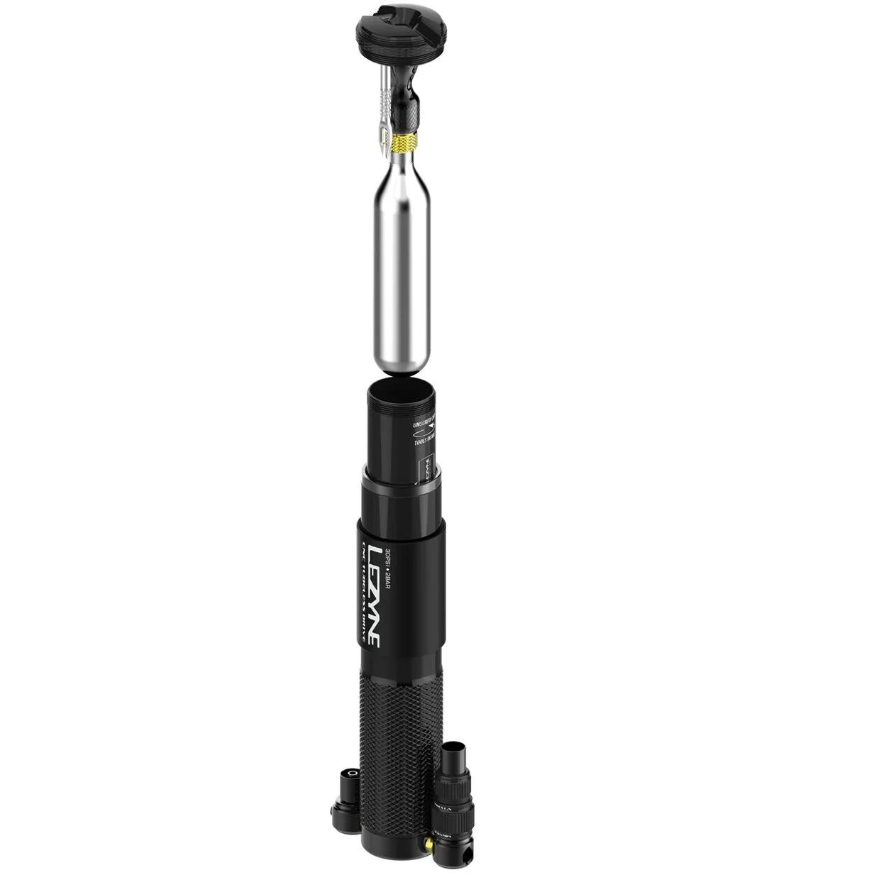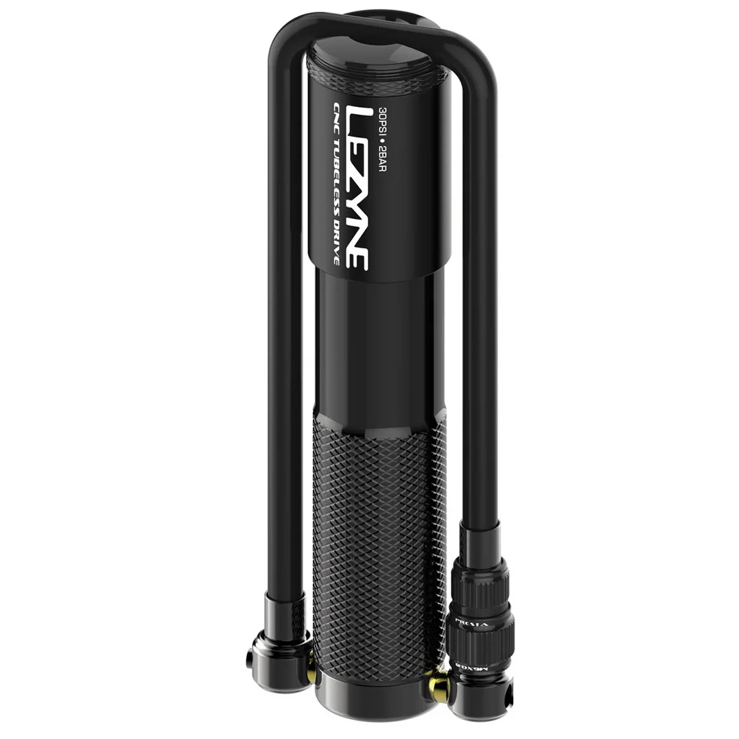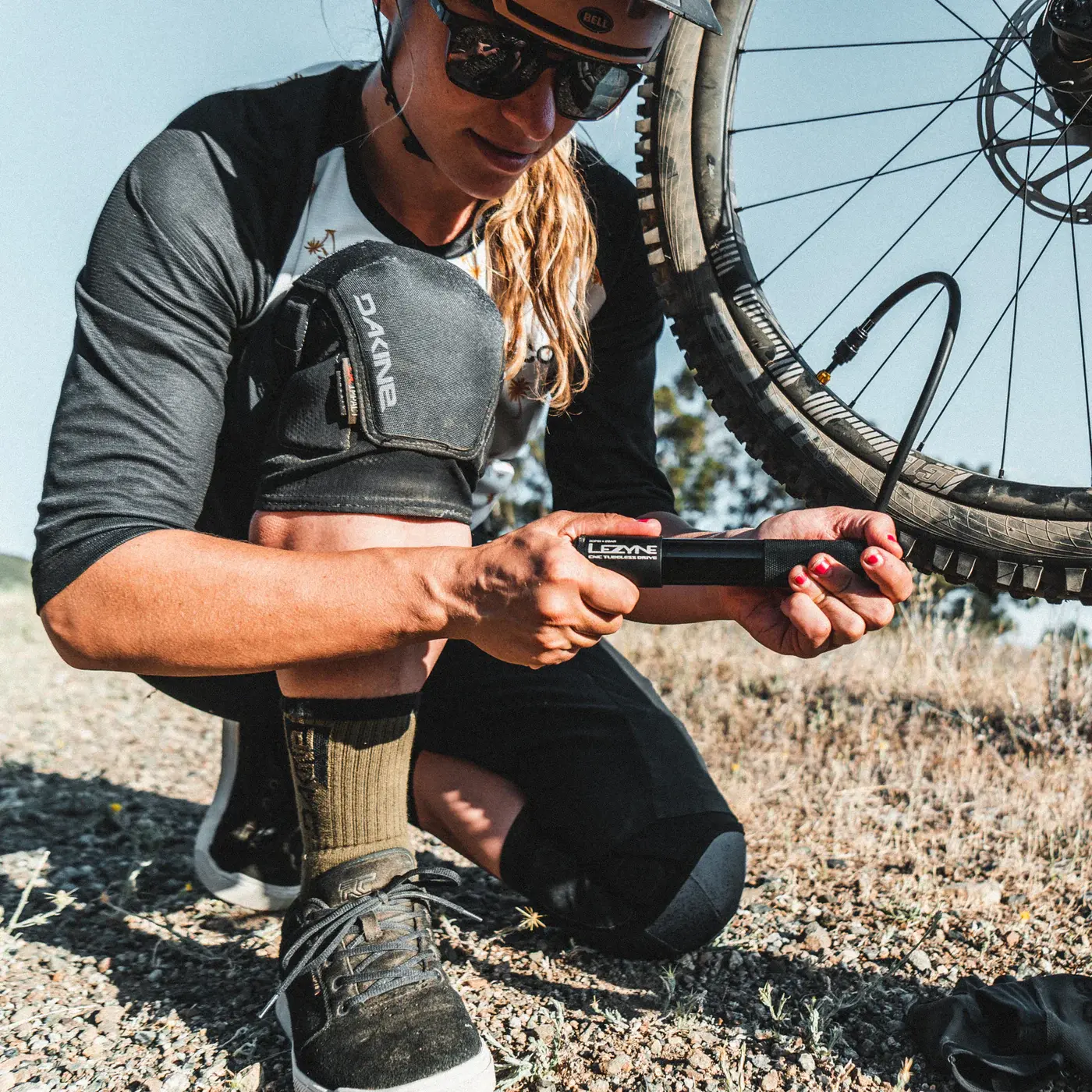 The CNC Tubeless Drive is an innovative 3-in-1 mountain bike hand pump engineered for high-volume tubeless tire repair and inflation. The compact system combines a tubeless tire repair kit, CO2 inflator and a high-volume hand pump—all conveniently housed in a lightweight machined aluminum construction. This allows for quick trailside repair. Its long hose, overlapping handle, and high volume design provides efficient inflation for up to 30 PSI (2 BAR). The chuck is tubeless specific and “flips” for Presta or a threaded Presta shaft (with the valve core removed) to provide more airflow when seating a tubeless tire. The CO2 inflator allows for instant inflation and additional tubeless tire seating power. It comes equipped with five aggressive, high quality tire plugs that are sealant friendly as well as one replaceable 20-gram CO2 cartridge. The rebuildable CNC Tubeless Drive is the ultimate repair setup for mountain bikes and e-bikes using high-volume tubeless tires.