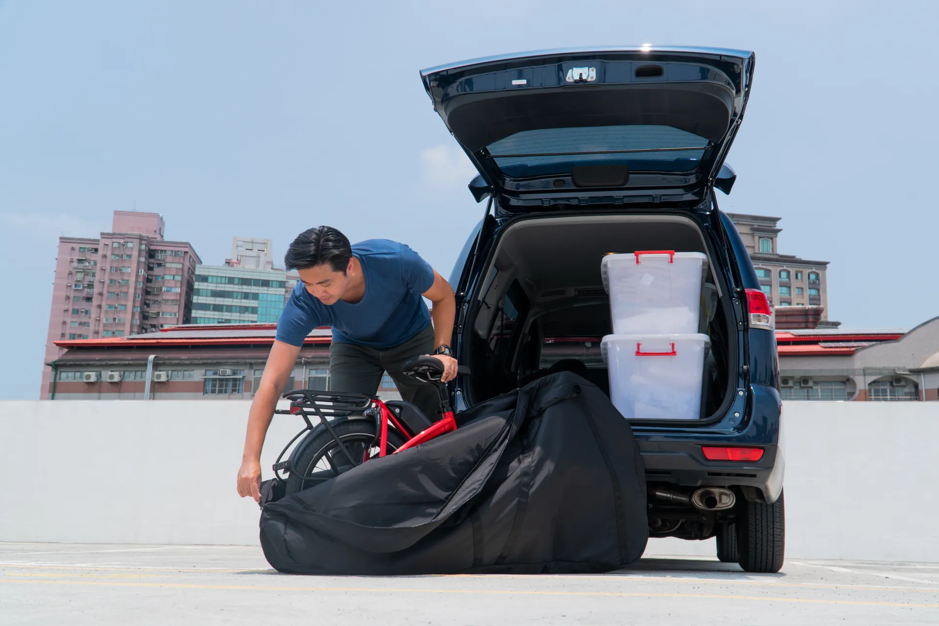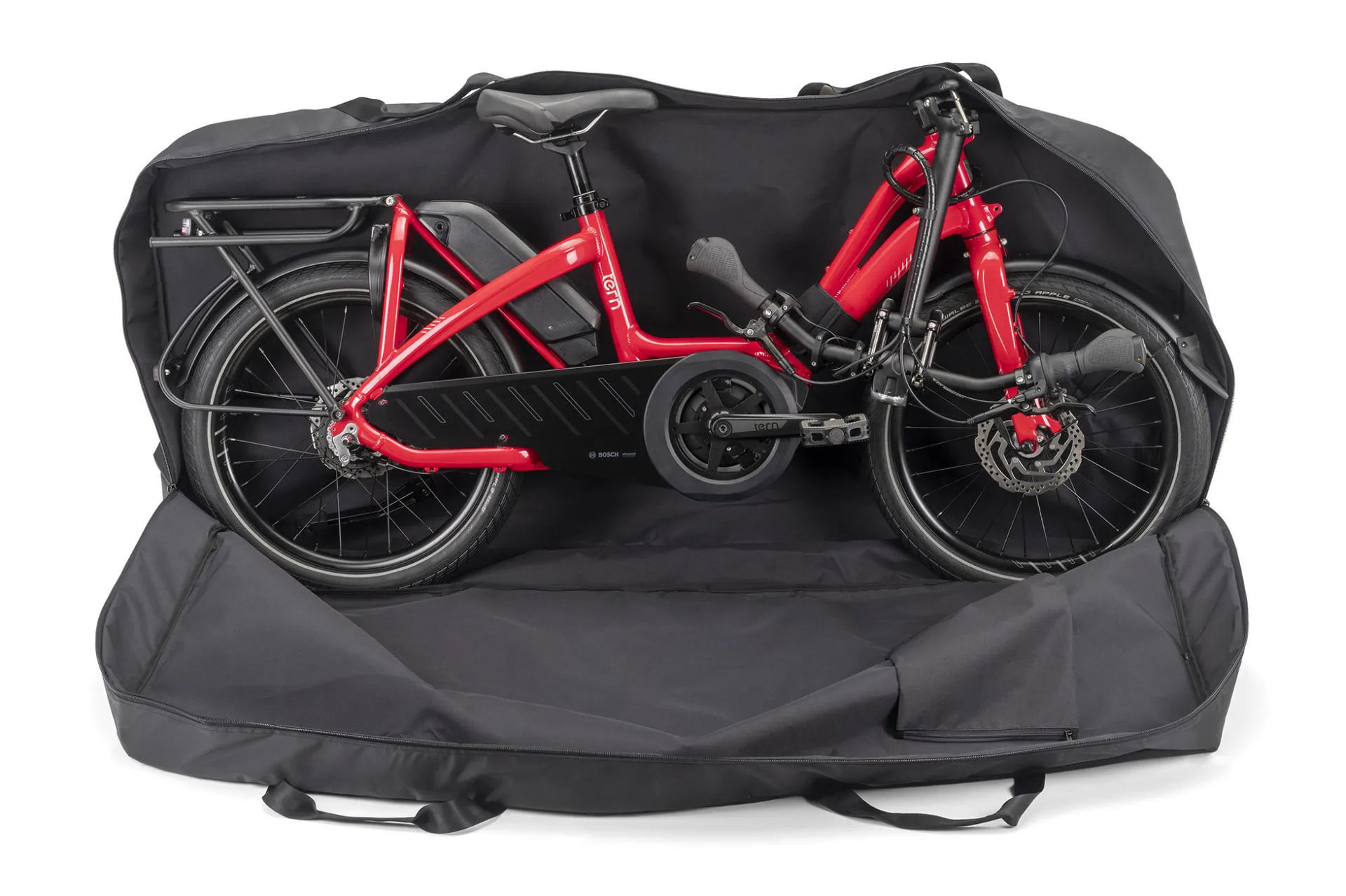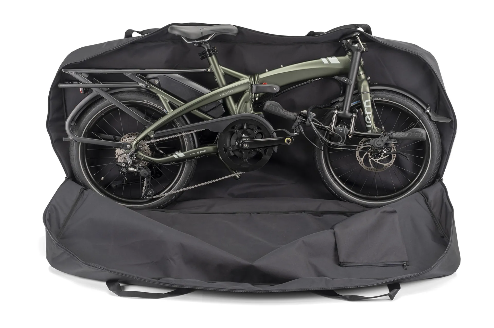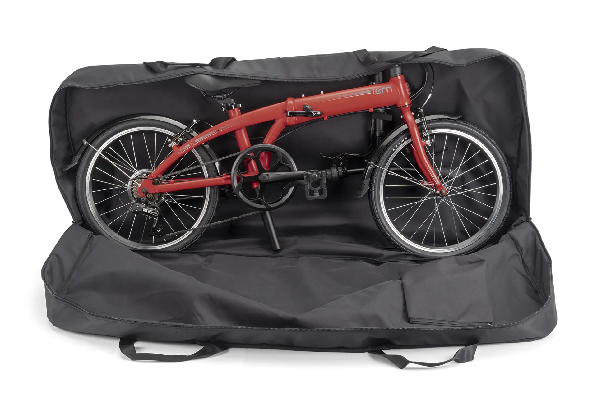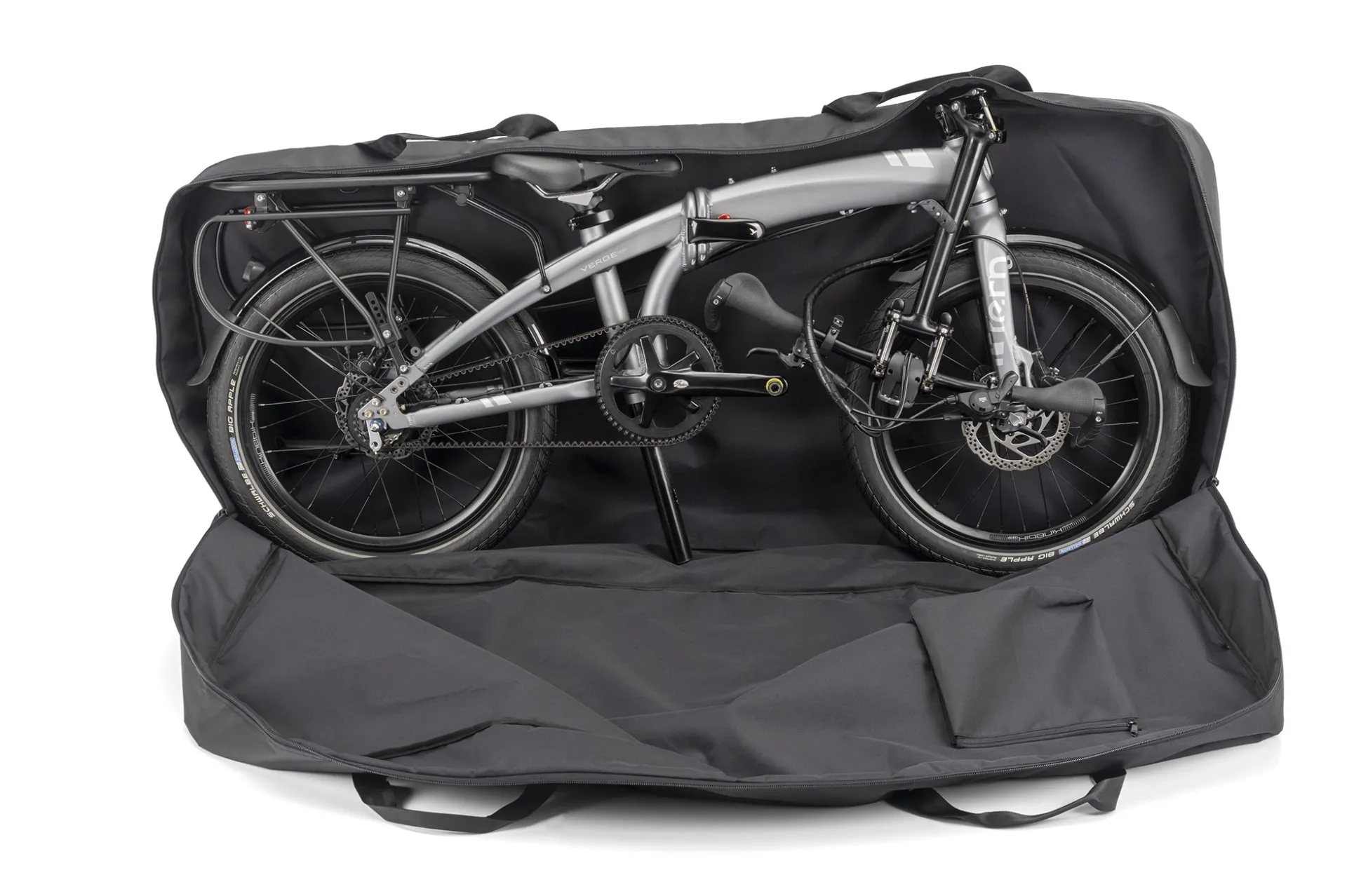 The FlatFold Bag, S protects your bike against bumps and scratches using BlueSign® certified nylon and padded construction. Whether you're transporting or simply storing, the long and narrow form is ideal for tight spaces including SUVs, campers and RVs, or bus luggage compartments. The internal pocket conveniently holds pedals, tools, or other essentials, and the bag is designed to snugly fit the NBD or other Tern 20 inch folding bikes.