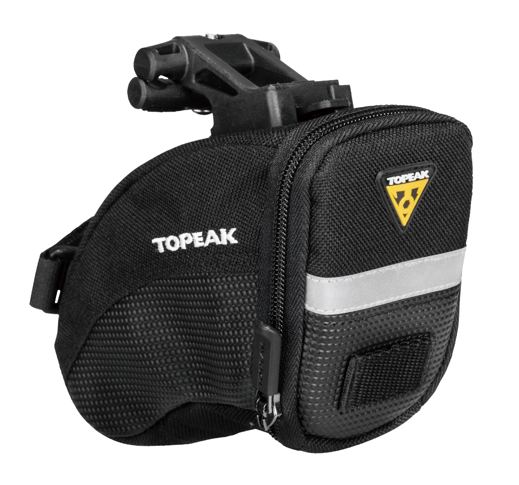 Aerodynamic seat bag holds tubes, tools and other repair items. Mounts and removes quickly with Topeak's innovative QuickClick® system.