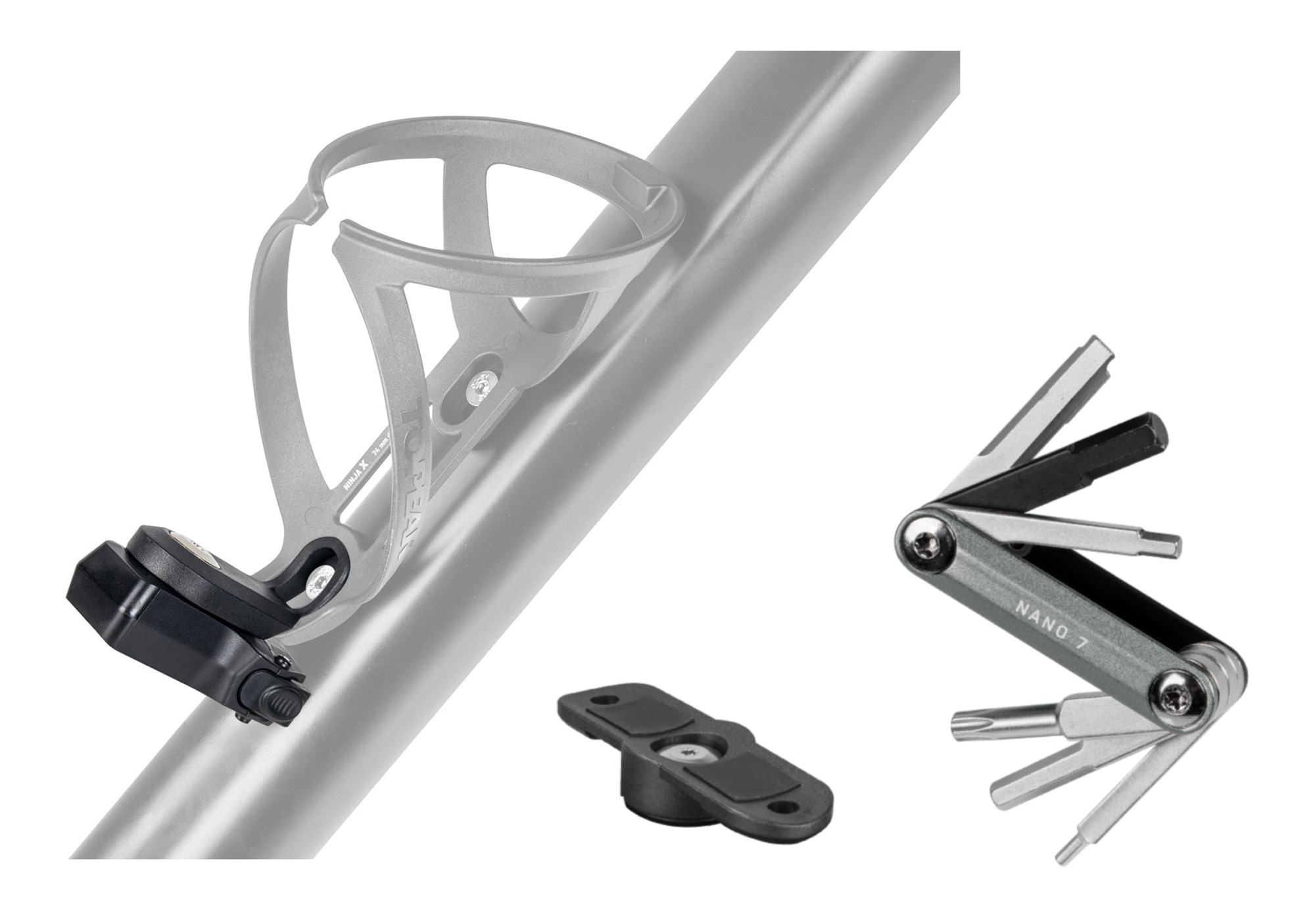 Mount to Ninja+ Cage series with included Cage Mount. Install on frame, stem, seatpost, or water bottle boss with included Frame Mount and zip ties |